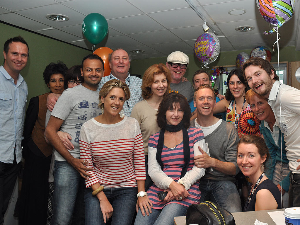 The team. Top row left to right: Michael Vaughan, Moira Stuart, Broadcast Assistant Sara Clifford's (eyes only), Chris's assistant Hiten Vora, Alan Dedicoat, Lynn Bowles, Chris Evans, Broadcast Assistant Joe Schmo, Hells Bells from Hull, Assistant Producer Suzi D, Assistant Producer Tom. Bottom row left to right: Jonny's sister Lucy, Jonny's wife Kate, JONNY, Assistant Producer Sam.