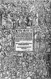 |  Cover of Bible written in English, showing a cross section of Society with Henry Vlll at the top. | There was a new vernacular Bible and the new English liturgy set out in the Book of Common Prayer. In many ways the people were powerless to prevent these changes. Their spiritual lives were transformed as local shrines and cults were outlawed and the activities, services and festivities of the parish were altered.