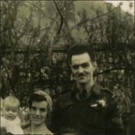 Eileen's father is the tall soldier in uniform on the far right of the picture, her mother is in front wearing a headscarf and holding Eileen. The picture was taken at the wedding of Harold Waddell when he was staioned in Knaphill with Eileen's father
