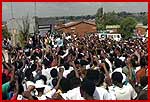 Soweto demonstration |  | English became the language of freedom and the ANC adopted it. It was also the language of the international media. In Soweto in 1976 there was a revolt by pupils that proved a catalyst for renewed widespread opposition to the ruling Afrikaner government. It marked the beginning of the end of the apartheid regime. |  |  |