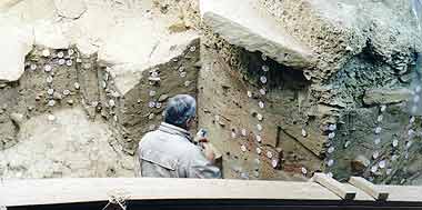 | Left:Jim Adovasio examines the excavations inside the Meadowcroft rock shelter. The oldest layers may date back 16,000 years. |