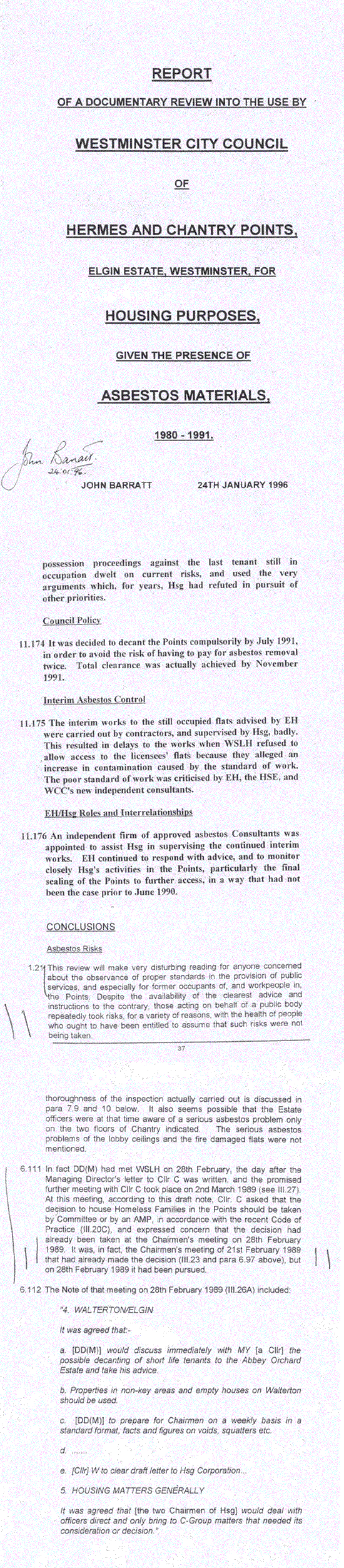 His report, entitled "Report of a Documentary review into the use of Westminster Council of Hermes and Chantry Points, Elgin Esate, Westminster, for Housing purposes given the presence of Asbestos materials 1980-1991" was issued on January 24th, 1996.