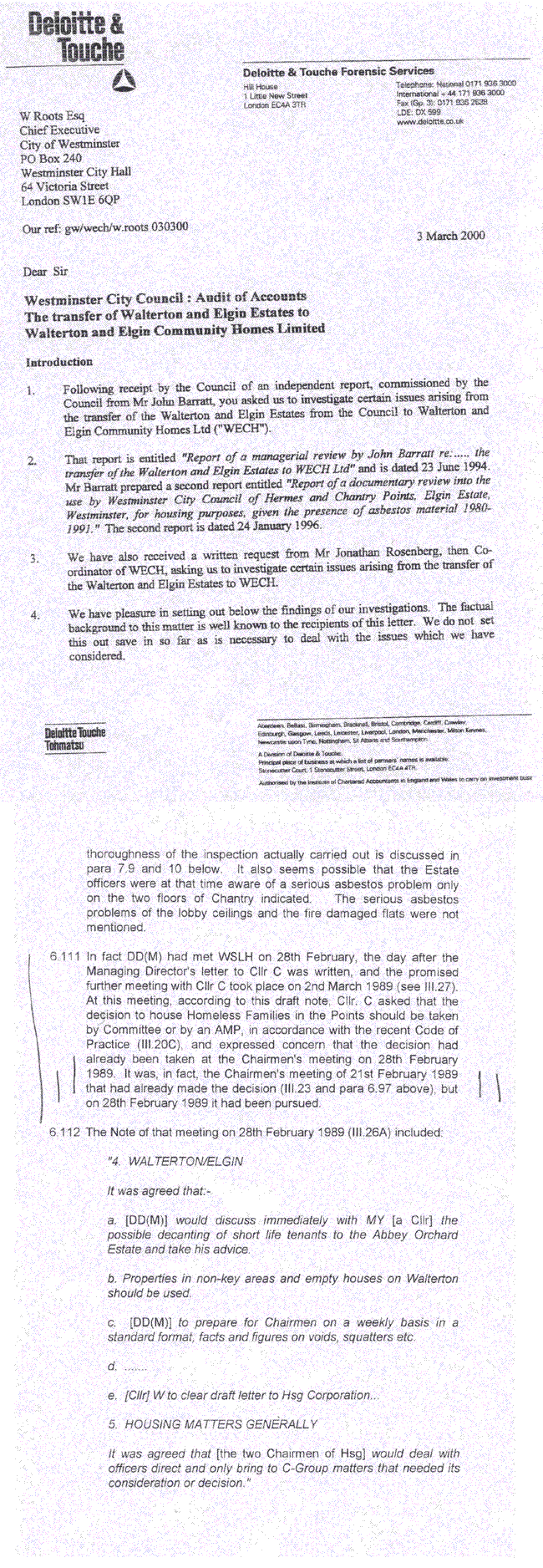 Aside from the health risks, there is the issue of lawfulness. In a letter to Bill Roots, the then Chief Executive of Westminster City Council on March 3rd, 2000, the District Auditor John Magill (of Deloitte and Touche Forensic Services) said that decisions that were made by councillors who were acting without proper authority were unlawful as his notes make clear.