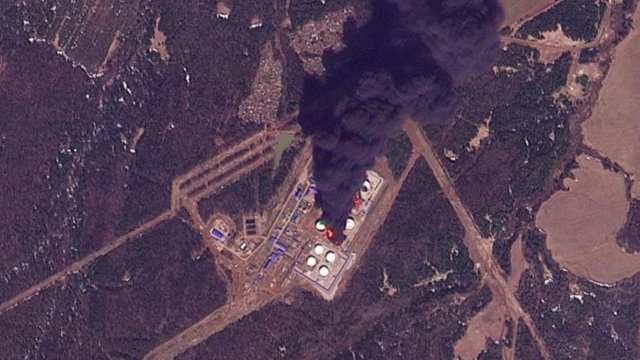 После атаки в ночь на среду на спутниковом снимке с PlanetLabs в Перми виден пожар как минимум на двух резервуарах с топливом на ЛПДС «Пермь».