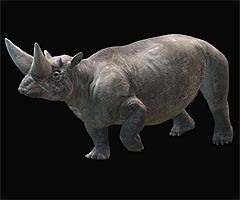 Arsinoitherium's most distinctive feature was the two large horns on their snouts. The horns were hollow and possibly used to produce loud mating calls as well as to compete with rival males. Arsinoitherium was a hefty creature with thick, hairless skin resembling elephant hide. Arsinoitherium was very selective in the types of fruit and leaves it ate. Its size meant it had to eat a lot of food - it probably spent much of its day chewing on something. Arsinoitherium lived in small groups and would have been in the water most of the time. It couldn't straighten its legs, suggesting they were better for wading and swimming than for walking. Its large size kept it safe from most predators, although creodonts might tackle a young Arsinoitherium. |
