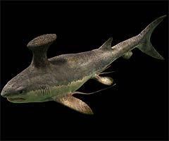 Stethacanthus resembled modern sharks to an extent, except for its outrageous dorsal fin - the shape of an ironing board - that it seems was part of courtship display as it is found in the males only. The top of this fin was covered in rough, tooth-shaped scales that match a patch of skin on the Stethacanthus' snout. Was this supposed to mimic a huge mouth and make the creature appear more frightening? Stethacanthus tended to patrol shallow coastal waters on the lookout for food. It ate small fish, crustaceans and cephalopods (eg goniatites). There's evidence Stethacanthus may have been migratory, returning to particular places to mate and give birth. It could certainly swim quite fast, although not quickly enough to evade a hungry Dunkleosteus. |