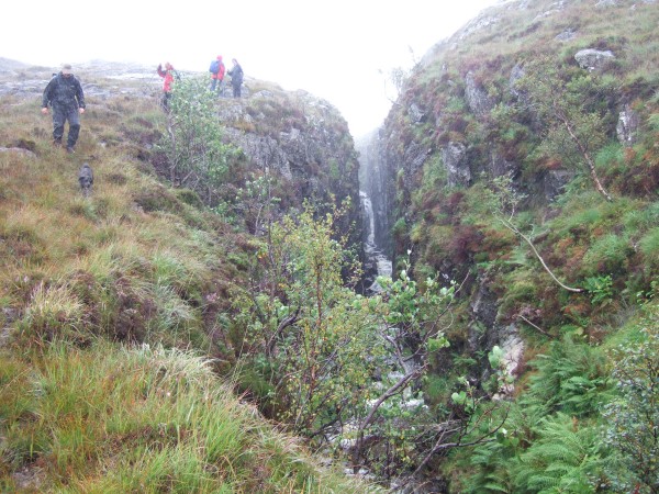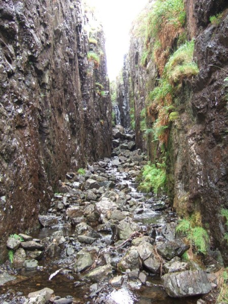 Th LBRD runs from Loch Ba up on to Beinn a Ghraig down to Glen Clachaig, round Beinn Chaisgidle, over to Glen Forsa and then back over to Loch Ba. It is about 15 miles in length. The most obvious part of it is the section running up to Beinn a' Ghraig, where it appears as a definite feature against the skyline. Ring dykes are also found in Ardnamurchan as well as Glencoe.Although the LBRD is one of the last igneous events in Mull, it is actually traversed by some later dykes. One of these has weathered out to give this chasm: