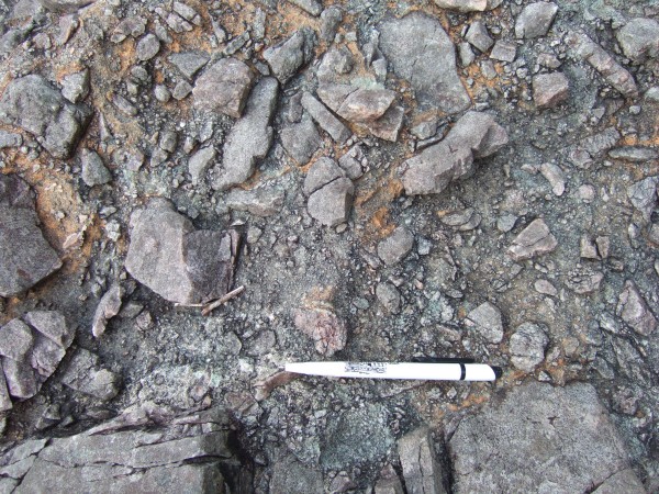 This is more like it. Rock. Hard Rock. Lots of it. Here we have an intrusion breccia. Good word that. The basalt that lies at a higher level has been intruded and generally chopped up by other igneous material. Very common in this area.