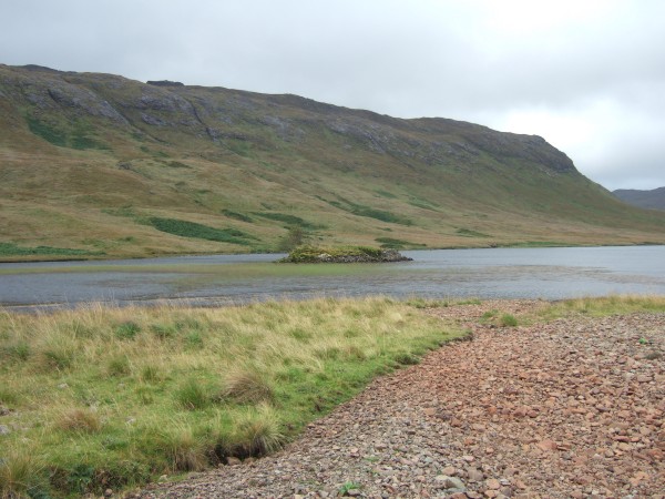 This is the start of the walk, at Loch Sguaban. Note the crannog in the loch. Its quite boggy and tussocky here, so we were keen to get as far uphill as possible.