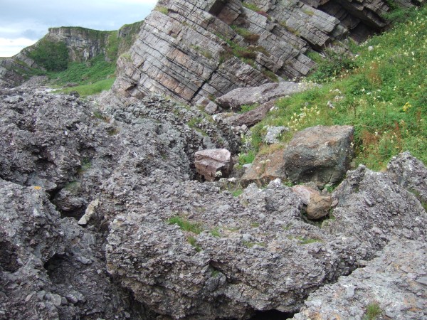 Although a lot of the rock is psammite, there are huge boulders of the various sedimentary and igneous rocks that outcrop further up the cliffs. One of the great things about this area is that you get the "big three" - igneous, sedimentary and metamorphic rocks all occuring together, and showing tremendous variety as well. The sedimentary rocks are conglomerates, limestones, sandstones and stuff like that. Some of the boulders are huge.