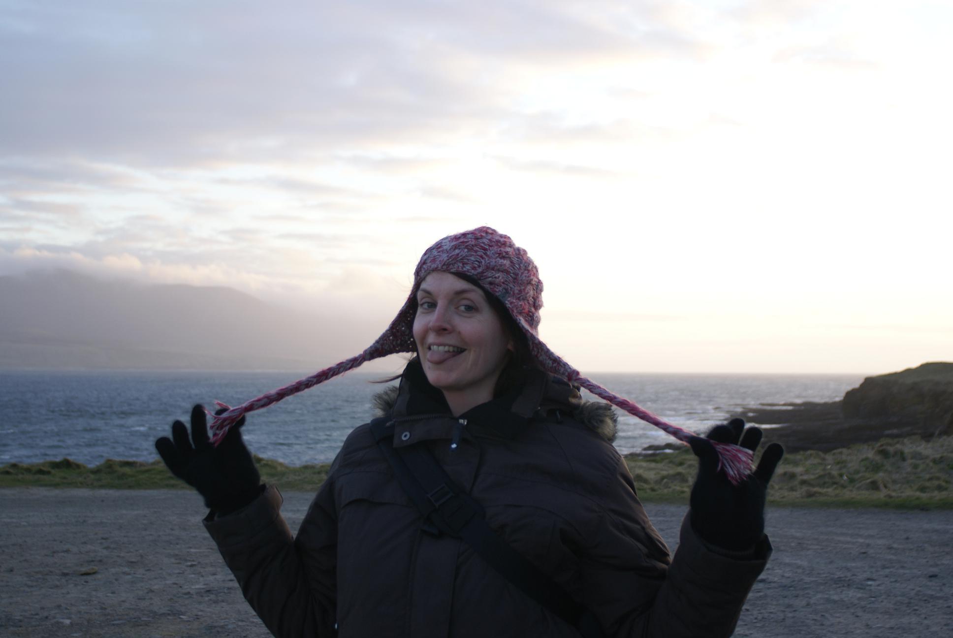 Also I've been catching up with various friends that I havn't seen for a while, which has been all very enjoyable. I went a walk to the Ness in Stromness the other night with a pall, we intended to make it a good pulse-increasing hour, but got cold and instead scurried off to another friends for a couple glasses o wine! Here's a shot she took of me with borrowed hat, and Hoy (nearly visible in the haze) in the background.