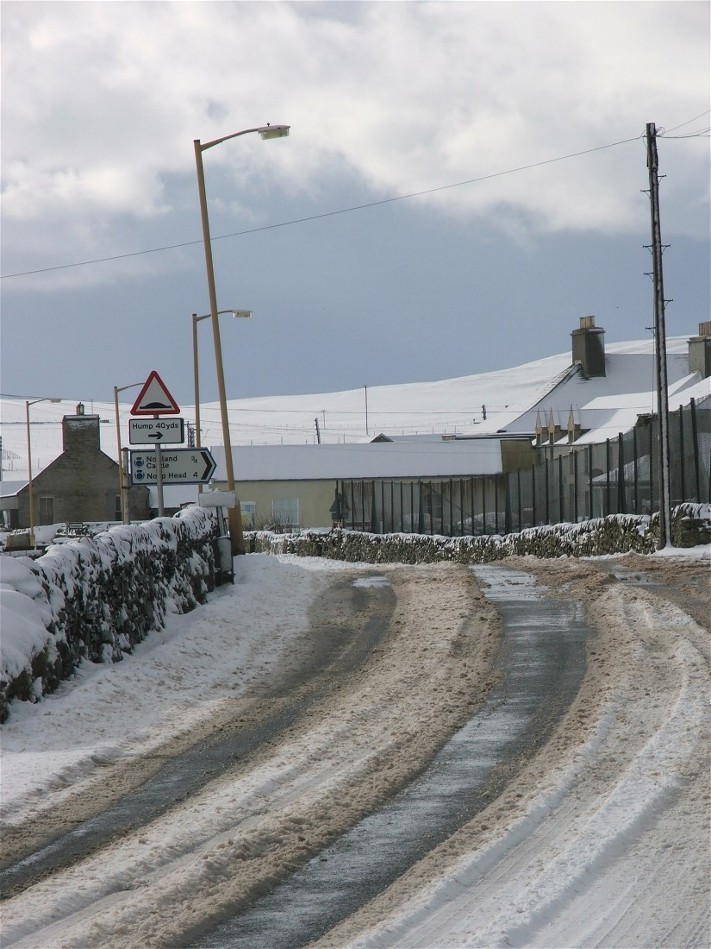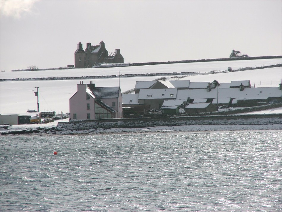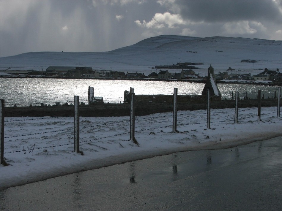 This photo was taken at 7.45am on Wednesday 22nd February. It looks down a slipway and accross Pierowall Bay