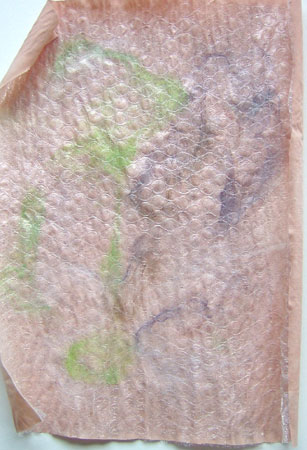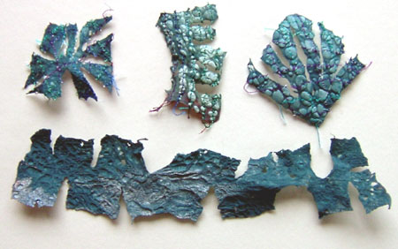 when looking in Gwen Hedley’s book and wondering about the base fabric, I was interested in making plastic fabrics, then I was looking through Creative Quilts by Sandra Meech and there is a bit in that about making a plastic and fabric sandwich, so that’s what I did, but the first one was too light,
