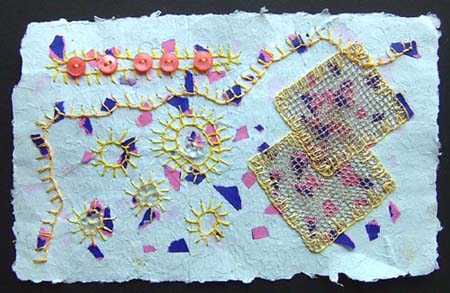 the first thing I learnt with this sample is I have used too light a colour thread as the dark spots in the paper dominate I really wish now I had used a dark thread….are well…., on the right around the little gold mesh squares is blanket stitch and all the rest is buttonhole stitch, I felt I couldn’t do a sample of buttonhole stitch without putting some buttons on it somewhere,