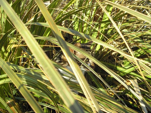 In the middle of the Pampas Grass the cats have made a small flat area which is hidden from the outside world and there they sit waiting.