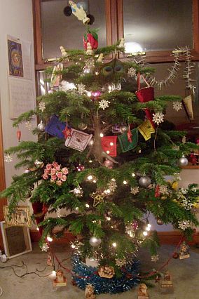 I couldn't find a tree topper so I crammed a statue of the Virgin Mary on the top of the tree. She's listing to port but that's ok. Notice how well her white and blue colour scheme sets off the bright red of the plastic chili peppers...