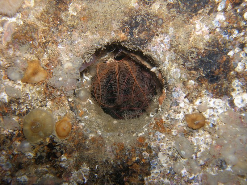 Dropping in on the Coln I am pleased to find that the fairly small green ping pong ball of Wednesday seems to have increased somewhat and the vis has cleared a little. Heading aft we remain high over the wreck and find the high elevation anti aircraft gun festooned with life, the torpedo tube sticking up like a metal chimney with a lid from the twisted green and grey metal of the wreck. Carrying on aft we find both of the big guns and eventually run out of wreck. I then get to drive, Hazel having satisfied her appetite for rust, we go off fish hunting. Sticking close to where the now flat-ish hull meets the vertical-ish deck we drift over empty black portholes, shining even both torches inside reveals nothing of the cavernous space below us. One has a large edible crab just swinging himself onto the hull, but he rapidly tries to disappear as we come closer. However, crabs maybe are not the brightest of marine life and he merely hangs upside down inside the wreck by leaving one leg poking around the edge of the hole. Well, this is too much for me to resist, and coming closer I gently flick the leg off its perch and watch him cursing his way into the dark oblivion below. If crabs could swear, I bet he was.