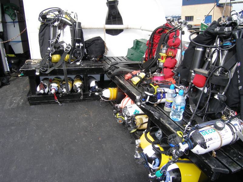 My drysuit was retrieved from under the whaleback, as was a bag with most of the bits and bobs in it. Wing was on top of the freezer, twinset was where it always lives, lead was in the little pile by the compressor, fins were under the hammocks etc etc. Eventually i had the right gear and the worry started – would my bum still fit into my drysuit.....eek.