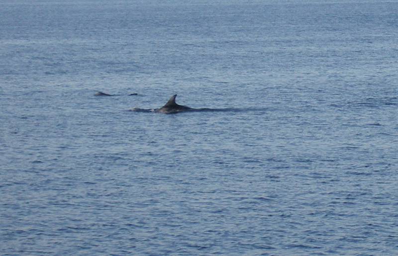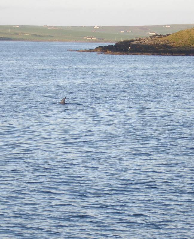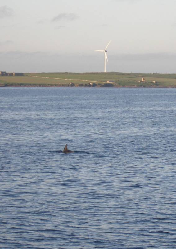 Gradually the sea flattens and we cruise northwards towards Copinsay eventually dropping anchor in Holm Sound keeping us out of the worst of the swell. As we enter the bay beside the churchill barriers Hazel spots large dorsal fins break the surface. The unusual shaped heads and large fins have me scrambling for the identification sheet and find that they are a pod of Risso's Dolphins - three mature animals pootling around no doubt looking for something tasty to munch on.