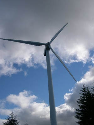 "What with the debate on wind farms still raging on Island Blogging I thought I'd submit a couple of pictures from a recent trip up into the hills above Carradale, to Deucheran Hill in fact, where one of Kintyre's windfarms is sited. Both pictures (attached) show turbine number 8. In one you can see the turbine 'head' clearly whereas in the other our Landrover is shown to add a bit of scale."