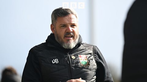 Manager Brennan speaks with BBC's Alan Seabrook following the 3-2 win at home