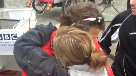 @sportrelief, 2 March: Despite his leg giving him more & more pain, John has made the lunch stop & gets a hug from wife Mel #BishopsHell