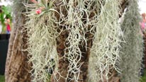 Spanish moss, Tillandsia usnoides, is an air plant, it has no roots and anchors itself by gently hooking on with its curved leaves. To keep it happy in dry weather mist it with water; airplant expert recommends adding a few drops of dilute liquid fertilizer to encourage it to grow – it can double in size in a year! In warmer parts of the country it can survive outside all winter.
