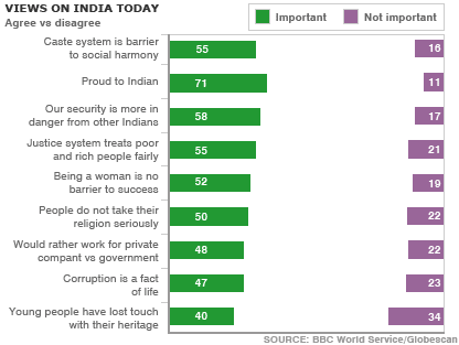 بی بی سی کے پول کے مطابق بھارتی عوام اپنے ملک کو ایک عالمی طاقت دیکھنا چاہتے ہیں اور ان کے خیال میں ذات پات کا نظام اس حوالے سے ایک بڑی رکاوٹ ہے۔ بی بی سی ورلڈ سروس کے اس پول میں حصہ لینے والے پچپن فیصد افراد کے خیال میں بھارت میں ذات کا نظام’معاشرتی ہم آہنگی‘ میں ایک بڑی رکاوٹ ہے۔ دو تہائی بھارتیوں کا ماننا ہے ملک کو ایک اقتصادی سپر پاور ہونا چاہیے جبکہ ساٹھ فیصد کے نزدیک اقتصادی قوت کے ہمراہ سیاسی اور ساٹھ فیصد کے ہی خیال میں عسکری طاقت بننا بھی ضروری ہے۔ اس پول سے یہ بھی پتہ چلا ہے کہ اکہتر فیصد افراد بھارتی ہونے پر فخر محسوس کرتے ہیں اور اکثریت جدید بھارتی ریاست کے بیشتر پہلوؤں کے حوالے سے پرامید ہے۔ نصف سے زائد کے خیال میں بھارت کا عدالتی نظام غریب اور امیر دونوں سے یکساں سلوک کرتا ہے اور باون فیصد کا ماننا ہے کہ اب بھارت میں عورت ہونا ترقی کی راہ میں رکاوٹ نہیں۔ سروے میں شامل اڑتالیس فیصد افراد نجی اداروں کے لیے کام کرنے کے متمنی ہیں جبکہ حکومتی اداروں کے لیے کام کرنے کی خواہش رکھنے والوں کی تعداد صرف بائیس فیصد ہے۔