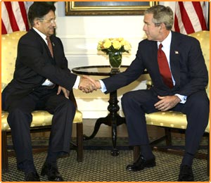 پاکستان امریکہ کی دہشت گردی کے خلاف جنگ میں صفِ اول کے حلیفوں میں سے ہے۔ پاکستان کی اس پالیسی کا سہرا جنرل مشرف کے سر پر باندھا جاتا ہے جس کا اعتراف امریکی صدر جارج بش بھی اور کئی اہم امریکی اہلکار بارہا کر چکے ہیں۔ خود جنرل مشرف بھی صدر بش سے اپنے قریبی سیاسی اور ذاتی مراسم کا اظہار کرتے ہیں۔ صدر بش اور صدر مشرف کی یہ تصویر ستمبر میں اقوامِ متحدہ کے اجلاس کے ایک دن بعد نیویارک کے ایک ہوٹل میں ملاقات کے دوران لی گئی۔ اس کےلئے کم سے کم الفاظ میں عنوان تجویز کیجئے۔