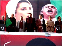 اتوار کو راولپنڈی میں ہونے والے پاکستان پیپلز پارٹی کے جلسے کو دیکھ کر لگتا ہے جیسے ملک میں واقعی انتخابی مہم شروع ہو چکی ہے۔ اس جلسے سے پہلے انتخابی سرگرمیاں صرف صدر جنرل پرویز مشرف تک محدود تھیں۔ پچھلے چند ہفتوں میں پاکستان کے فوجی صدر نے مختلف شہروں میں پے در پے جلسے کر کے عوام سے اپنی حمایتی جماعت یعنی مسلم لیگ ( ق) کے لیے ووٹ مانگے۔ اس طرح کھل کر اپنے حمایتیوں کے حق میں جلسے کرنے پر ان پر تنقید بھی ہوئی لیکن بقول وزیر اطلاعات محمد علی درانی کے، پاکستان جیسے ملک کے صدر کو غیر سیاسی سمجھنا نادانی ہے۔ بہرحال صدر چونکہ ایک تو باوردی ہیں اور دوسرے پورے ملک کا انتظامی ڈھانچہ بھی ان کے ہاتھ میں ہے اس لیے ان کی تمام تر انتخابی مصروفیات کے باوجود بھی وہ تاثر پیدا نہ ہو سکا جو پیپلز پارٹی نے ایک جلسے سے کر دیا۔ اصلی سیاسی جلسوں کا ماحول ہی کچھ اور ہوتا ہے۔ جن لوگوں نے اب تک صرف صدر مشرف کے سرکاری جلسے دیکھے ہیں انہیں اس بات کا اندازہ ہفتہ کی رات ہوا ہو گا جب راولپنڈی کے لیاقت باغ کے آس پاس کے سارے علاقے نے ایک بڑی جلسہ گاہ کا روپ دھارا۔