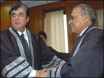 ان کی غیر حاضری میں ڈیوٹی پر موجود ججوں میں سے سینئر جسٹس جاوید اقبال کو قائم مقام چیف جسٹس آف پاکستان مقرر کر دیا گیا ہے، جنہوں نے اسلام آباد میں ہونے والی ایک تقریب میں اپنے عہدے کا حلف بھی اٹھا لیا ہے۔ حلف جسٹس عبدالحمید ڈوگر نے لیا۔ تقریب میں چاروں صوبائی ہائی کورٹس کے چیف جسٹس صاحبان بھی موجود تھے۔ حلف برداری کی تقریب کے بعد قائم مقام چیف جسٹس اور جسٹس ڈوگر سے پوچھا گیا کہ جسٹس بھگوان داس کی واپسی پر چیف جسٹس کون ہوگا تو دونوں جج صاحبان نے کوئی جواب نہیں دیا۔ ایک دوسرے سوال کے جواب میں قائم مقام چیف جسٹس کا کہنا تھا کہ آئین کے تحت سپریم جوڈیشل کونسل پہلے سے قائم ہے اور وہی جسٹس افتخار چوہدری کے خلاف بھیجے گئے صدارتی ریفرنس کی سماعت کرے گی۔ معطل چیف جسٹس کے بارے میں ایک عام تاثر تھا کہ انہوں نے از خود کارروائی کرتے ہوئے بہت سے غریبوں کو سہولت دی۔ لیکن بعض لوگ کہتے ہیں کہ چیف جسٹس نے اختیارات کا ناجائز استعمال کرتے ہوئے اپنے بیٹے کو اہم ملازمت دلوائی۔