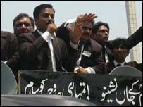 کوئٹہ میں بی بی سی اردو کے نمائندے عزیز اللہ کے مطابق سپریم جوڈیشل کونسل میں سماعت کے موقع پر بلوچستان میں بھی وکلاء نے عدالتوں کا بائیکاٹ کیا اور کوئٹہ میں وکیلوں کے علاوہ سیاسی جماعتوں نے بھی احتجاجی مظاہرے کیے۔ بلوچستان ہائی کورٹ بار ایسوسی ایشن کے صدر ہادی شکیل ایڈووکیٹ نے بتایا کہ آج عدالتوں کا بائیکاٹ کیا گیا اور کوئٹہ میں علامتی بھوک ہڑتال کا سلسلہ جاری رہا۔ کوئٹہ میں ضلع کچہری سے وکلاء نے ایک ریلی نکالی جو شارع عدالت سے ہوتی ہوئی واپس زرغون روڈ پر ٹی اینڈ ٹی چوک پہنچی جہاں وکلاء نے دھرنا دیا اور انسانی ہاتھوں کی زنجیر بنائی۔ وکلاء نے اس موقع پر سخت نعرہ بازی کی جن میں ’گو مشرف گو‘ ’مشرف تیرے ضابطے ہم نہیں مانتے‘ اور ’امریکہ سے تیرے رابطے ہم نہیں مانتے‘ اور ’ہمارا چیف زندہ باد‘ جیسے نعرے نمایاں تھے۔ اس کے علاوہ پاکستان مسلم لیگ نواز اور تحریک انصاف کے کارکنوں نے کوئٹہ پریس کلب کے سامنے علیحدہ علیحدہ مظاہرے کیے۔ مظاہروں میں دونوں جماعتوں کے قریباً دو درجن لوگ شامل تھے۔ پشاور سے بی بی سی کے نمائندے رفعت اللہ اورکزئی کے مطابق غیر فعال چیف جسٹس کی پیشی کے موقع پر سرحد بار کونسل اور پشاور بار ایسوسی ایشن کے اراکین نے پشاور ہائی کورٹ کے سامنے دھرنا دیا اور وکلاء نے صوبے بھر میں عدالتی کارروائی کا بائیکاٹ کیا۔ دھرنے کی قیادت پشاور ہائیکورٹ بار ایسوسی ایشن کے صدر عبدالطیف آفریدی ایڈوکیٹ نے کی۔ دھرنے سے قبل سرحد بار کونسل اور پشاور ہائیکورٹ بار ایسوسی ایشن کی جنرل باڈی کا اجلاس بھی ہوا جس میں پیشی کے موقع پر اسلام آباد جانے والے مظاہرین کو اٹک پل پر روکے جانے کی مذمت کی گئی۔ اجلاس سے خطاب کرتے ہوئے مقررین کا کہنا تھا کہ حکومت لوگوں کو ان کے جمہوری حق سے روک رہی ہے۔ |