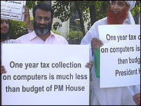 ارشد جنجوعہ کا کہنا تھا کہ حکومت اس انڈسٹری سے ریونیو حاصل کرنا چاہتی ہے اسی لیے ٹیکس لگایا گیا ہے لیکن اس صنعت سے حاصل ہونے والا ٹیکس بھی کچھ زیادہ نہیں کیونکہ یہ صنعت ابھی بہت چھوٹی ہے۔ اُن کا کہنا تھا کہ گزشتہ ایک سال کے دوران پاکستان میں آئی ٹی کی صنعت میں اضافے کی بجائے سترہ فیصد کمی آئی ہے۔ اس موقع پر مظاہرین نے ’سی بی آر‘ کے خلاف نعرے بھی لگائے۔ انہوں نے پلے کارڈز بھی اُٹھا رکھے تھے جن میں سے ایک پر درج تھا:’کمپیوٹر پر لگنے والے ٹیکس سے جو رقم حاصل ہوتی ہے وہ پرائم منسٹر ہاؤس کے بجٹ سے انتہائی کم ہے‘۔ |