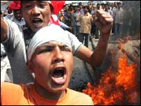 اتوار کی صبح سے نیپالی حکام نے کٹھمنڈو میں پھر سے دن بھر کا کرفیو نافذ کر دیا تھا اور شہر کے مرکزی علاقے کو جانے والے تمام راستوں کو خاردار تار لگا کر بند کر دیا تھا۔ سنیچر کو ایک لاکھ سے زائد مظاہرین نے دارالحکومت کے مرکز میں کرفیو کی خلاف ورزی کرتے ہوئے بادشاہت کے خلاف احتجاج کیا تھا۔یہ مظاہرین’ ہم بادشاہت نہیں جمہوریت چاہتے ہیں‘ کے نعرے لگا رہے تھے۔ ادھر سیاسی اپوزیشن نے شاہ گیانندرا کی جانب سے ایک کثیرالجماعتی حکومت میں شامل ہونے کی پیشکش کو مسترد کردیا تھا۔ |