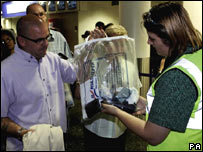 حفاظتی اقدامات کے تحت مسافروں پر پابندی عائد کی گئی تھی کہ وہ سفری دستاویزات، ادویات اور چند دیگر اشیائے ضرورت کے علاوہ کسی قسم کا دستی سامان جہاز پر اپنے ساتھ نہیں لے جا سکتے۔ اس کے علاوہ ہوائی اڈوں پر تمام مسافروں کی جامہ تلاشی کا عمل بھی شروع کیا گیا جس کی وجہ سے ’چیک ان‘ کے عمل میں زیادہ وقت لگا اور ہوائی اڈوں پر مسافروں کی طویل قطاریں لگ گئیں۔ برطانوی ہوائی اڈوں کی اس ہنگامی صورتحال کا اثر اندرونِ ملک پروازوں پر تو پڑا ہی لیکن اس سے برطانیہ آنے والی بین الاقوامی پروازیں بھی شدید متاثر ہوئیں۔ طویل فاصلے کی پروازوں کے مسافروں کو پرواز کے وقت سے چارگھنٹے قبل ہوائی اڈے پر پہنچنے کو کہا گیا اور ان اقدامات کے باوجود ہیتھرو سے روانہ ہونے والی متعدد بین الاقوامی پروازوں کو مسافروں اور سامان کی مکمل تلاشی میں لگنے والے وقت کی وجہ سے منسوخ کرنا پڑا۔ | اسی بارے میں بلیئر سے برطانوی مسلمانوں کا مطالبہ12 August, 2006 | آس پاس لندن سازش کیسے پکڑی گئی؟12 August, 2006 | آس پاس برطانیہ، امریکہ میں تفتیش جاری 12 August, 2006 | آس پاس ’ناکام منصوبہ‘ اور برطانوی اخبارات 11 August, 2006 | آس پاس گرفتار ہونے والوں کے نام11 August, 2006 | آس پاس ’پاکستان میں گرفتاریاں اہم تھیں‘10 August, 2006 | آس پاس | ||||||||||||||||||||||||||||||||||||||||