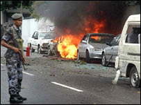 پاکستان کے دفتر خارجہ کی ترجمان تسنیم اسلم کا کہنا ہے کہ سری لنکا کے دارلحکومت کولمبو میں تعینات ان کے ہائی کمشنر بشیر ولی محمد پر پیر کے روز بم حملہ ہوا جس میں وہ بچ گئے ہیں۔ سرکاری خبر رساں ادارے نے ترجمان کے حوالے سے کہا ہے کہ اس حملے میں پاکستانی ہائی کمشنر بظاہرحملہ آوروں کا نشانہ تھے جس میں چار محافظ ہلاک ہوگئے ہیں۔ اس دھماکے میں مجموعی طور پر سات افراد ہلاک ہوئے ہیں۔ ہائی کمشنر بشیر ولی محمد کا کہنا ہے ’یقینی طور پر میں اس حملے کا نشانہ تھے‘۔ بی بی سی اردو کی ماہ پارہ کو تفصیلات بتاتے ہوئے انہوں نے کہا کہ ’میری گاڑی رفتار ذرا تیز تھی اور میں آگے نکل گیا تھا لیکن پھر بھی گاڑی کے عقبی شیشے ٹوٹ گئے اور میرے پیچھے آنے والی گاڑی اڑ گئی‘۔ ان کا کہنا ہے کہ ’نہیں کہا جا سکتا کہ حملہ کرنے والے کون ہو سکتے ہیں۔ بہت سے لوگ ہو سکتے ہیں۔ اس وقت یہاں سری لنکا میں بھی حکومت اور تامل باغیوں کا مسئلہ چل رہا اور ہماری حکومت خود مختار حکومت کی حمایت کرتی ہے اور دہشت گردی کے خلاف ہے۔ ان حالات میں کوئی بھی ہو سکتا ہے لیکن اس وقت کچھ کہنا قبل از وقت ہو گا‘۔ پاکستانی ترجمان نے اُسے دہشت گردی قرار دیتے ہوئے اس واقعے کی مذمت کی ہے۔ ان کے مطابق پاکستانی ہائی کمشنر کولمبو میں اپنے ہائی کمیشن میں یوم آزادی کی تقریب کے سلسلے میں پرچم کشائی کے بعد واپس اپنی رہائش گاہ آ رہے تھے کہ ان پر حملہ ہوا۔ ان کے مطابق اس دھماکے میں پاکستانی ہائی کمشنر کی گاڑی کو بھی نقصان پہنچا تاہم سفیر محفوظ رہے۔ پاکستان کے کولمبو میں ہائی کمیشن نے فون پر سرکاری ٹی وی چینل کو بتایا کہ دو کلیمور نامی بارودی سرنگیں ایک رکشے میں نصب کی گئی تھیں اور جنہیں بظاہر ریموٹ کنٹرول سے اڑایا گیا۔ بشیر ولی محمد کے مطابق دھماکہ دوپہر بارہ بج کر پچاس منٹ پر ہوا جس میں ان کی گاڑی کو نقصان پہنچا اور ’سیفٹی ایئر بیگز، کھلنے کی وجہ سے وہ محفوظ رہے۔ ان کے مطابق دھماکے کی جگہ موجود سترہ افراد زخمی ہوئے ہیں۔ واضح رہے کہ یہ ہلاکتیں ایک ایسے وقت ہوئی ہیں جب تامل ٹائیگر نے حکومت پر ایک یتیم خانے پر بمباری کرتے ہوئے تینتالیس بچوں کی ہلاکت کا الزام لگایا ہے۔ حکومت اس الزام کی تردید کرتی ہے۔ ہلاک ہونے والوں میں تین فوجی بھی شامل تھے۔ زخمیوں کو ہسپتال پہنچایا گیا ہے جہاں ڈاکٹروں کے مطابق ان افراد کو دھاتی ٹکڑوں یا جھلسنے سے زخم ہوئے ہیں۔ یہ دھماکہ صدر ماہندہ راجہ پکھشی کی سرکاری رہائش گاہ کے قریب ہوا ہے۔ | اسی بارے میں شمالی سری لنکا میں لڑائی شدید 13 August, 2006 | آس پاس کولمبو میں بم دھماکہ08 August, 2006 | آس پاس تامل باغیوں کا بحری جہاز پر حملہ01 August, 2006 | آس پاس | ||||||||||||||||||||||||||||||||||||||||