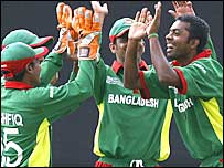 اتوار کو عالمی کپ کےگروپ میچوں کے مرحلے کے آخری میچ میں بنگلہ دیش برمودا کو ہرا کر اگلے مرحلے یعنی ’سپر ایٹ‘ ٹیموں کی صف میں شامل ہو گیا ہے۔ عالمی کپ کی فیورٹ ٹیموں میں سے اس میچ کی سب سے زیادہ اہمیت انڈیا کے لیے تھی کیونکہ اگر بنگلہ دیش ہار جاتا تو انڈیا عالمی کپ کے اگلے مرحلے یعنی ’سپر ایٹ‘ میں جا سکتا تھا، لیکن بنگلہ دیش کی فتح سے انڈیا بھی عالمی کپ سے باہر ہو گیا ہے۔ گروب بی کے آخری میچ میں، جسے تاخیر میں شروع ہونے کے بعد بھی بارش کی وجہ سے چار مرتبہ روکنا پڑا، برمودا نے 21 اوورز میں 94 رنز بنائے اور اس کے نو کھلاڑی آؤٹ ہوئے۔ ڈکورتھ لوئس کےطریقہ کار کے تحت بنگلہ دیش کو میچ جیتنے کے لیے اکیس اوورز میں 96 رنز کا ہدف ملا ہے جو اس نے تین وکٹوں کے نقصان پر حاصل کر لیا۔ کوئینز پارک اوول میں بارش کے باعث کھیل ڈیڑہ گھنٹے کی تاخیر سے شروع ہوا تھا جس کے باعث اووروں کی تعداد کم کر کے اکتالیس کر دی گئی۔ اس کے بعد بارش سے کھیل متاثر ہونے کے بعد اوورز کی تعداد پینتیس کی گئی، تیسری مرتبہ یہ تعداد گھٹا کر 30 اوور کی گئی اور چوتھی مرتبہ بارش تھمنے کے بعد جب برمودا کے بلے باز میدان میں اترے تو اس وقت اوورز کی تعداد مزید کم کر کے اکیس کر دی گئی۔ اس سے قبل بنگلہ دیش کے مشرف مرتضےٰ نے دوسرے ہی اوور میں برمودا کے اوپنر سٹیفن آؤٹبرج کو آؤٹ کر دیا تھا۔تیسرے اوور میں مشرفِ مرتضےٰ کو دوسری کامیابی اس وقت ملی جب انہوں نے بورڈن کو بھی محض دو کے ذاتی سکور پر آؤٹ کر دیا۔ برمودا کی مشکلات میں اس وقت مزید اضافہ ہوگیا جب دوسری جانب سے بالنگ کراتے ہوئے سید راسل نے ڈیوڈ ہمپ کو صفر پر آؤٹ کر دیا۔ بیٹنگ میں برمودا کو ڈیوڈ ہمپ سے خاصی امیدیں تھیں۔ڈیوڈ ہمپ کے آؤٹ ہونے کے بعد جب آخری مرتبہ اووروں کی تعداد کم کے اکیس کی گئی تو برمودا کے بلے بازوں نے خاصی جارحانہ بیٹنگ کا مظاہرہ کیا اور آخری پانچ اوورز میں پینتالیس سے زیادہ رنز بنائے۔ اس سے قبل بنگلہ دیش نے ٹاس جیت کر برمودا کو پہلے بیٹنگ کی دعوت دی۔ تـجزیہ کاروں کے مطابق بنگلہ دیش نے جس کارکردگی کا مظاہرہ اب تک کیا ہے اسے مد نظر رکھتے ہوئے یہ بات بہت اچھنبے کی ہوگی کہ آٹھ سال پہلے اپنا پہلا ورلڈ کپ کھیلنے والا یہ ملک اگلے مرحلے میں نہ جائے۔ اگرچہ بنگلہ دیش سری لنکا سے ہار گیا لیکن اس نے انڈیا جیسی فیورٹ ٹیم کو کھیل کے تمام شعبوں میں مات دی ہے۔ برمودا اپنے گزشتہ دونوں میچ ہار چکا ہے اور سوائے ڈیوڈ ہیمپ کے اس کا کوئی کھلاڑی پچاس رنز نہیں بنا سکا ہے۔ جمعہ کو انڈیا نے سری لنکا کے ہاتھوں شکست کھا کر بنگلہ دیش کی تقدیر اس کے ہاتھ میں دے دی تھی۔ بنگلہ دیش کے کپتان حبیب البشیر کا کہنا تھا ’ اس وقت ہمارے ذہن پر ایک ہی چیز ہے اور وہ ہے برمودا کو ہرانا لیکن صاف ظاہر ہے ہمیں احساس ہے کہ اس میچ میں کامیابی کے بعد ہم اگلے مرحلے میں پہنچ جائیں گے۔‘ آج تک ورلڈ کپ کھیلنے والا سب سے چھوٹے ملک برمودا کو گزشتہ دونوں میچوں میں بری شکست کا سامنا کرنا پڑا تھا۔ سری لنکا نے اسے 243 رنز سے ہرایا جبکہ انڈیا نے 257 رنز سے، جوکہ محدود اوورز کے میچوں میں کسی بھی ٹیم کی سب سے بڑی شکست ہے۔ بنگلہ دیش: برمودا: |