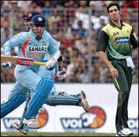 بھارت نے سہ فریقی ٹورنامنٹ کے دوسرے میچ میں پاکستان کو ایک سو چالیس رن سے شکست دے دی ہے۔ میرپور میں کھیلے جانے والے میچ میں بھارت نے پاکستان کو فتح کے لیے 331 رن کا ہدف فراہم کیا تھا لیکن پاکستان کی پوری ٹیم ایک سو نوّے رن بنا کر آؤٹ ہو گئی۔ پاکستان کی جانب سے کپتان شعیب ملک کے علاوہ کوئی بھی بیٹسمین قابلِ ذکر کارکردگی کا مظاہرہ نہ کر سکا۔ وہ 53 رن بنا کر آؤٹ ہوئے۔ بھارت کی جانب سے پروین کمار اور پیوش چاؤلہ نے چار، چار جبکہ ایشانت شرما اور یوراج سنگھ نے ایک، ایک وکٹ حاصل کی۔ پاکستان کے آؤٹ ہونے والے دیگر کھلاڑیوں میں سلمان بٹ کو پروین کمار کی گیند پر روہت شرما نے کیچ کیا، انہوں نے آٹھ رن بنائے۔ یونس خان اس سیریز میں پھر ناکام رہے اور لگاتار دوسرے میچ میں صفر پر آؤٹ ہوئے۔ محمد یوسف کو بھی پروین کمار نے ہی ایل بی ڈبلیو کیا۔ کامران اکمل آؤٹ ہونے والے چوتھے کھلاڑی تھے جو اڑتیس رن بنا کر پروین کمار کا چوتھا شکار بنے۔ مصباح الحق اور کپتان شعیب ملک کے درمیان صرف تیرہ رن کی شراکت ہوئی اور چورانوے کے سکور پر ایشانت شرما نے مصباح کو آؤٹ کیا۔ شاہد آفریدی تئیس رن بنا سکے اور پیوش چاؤلہ کا شکار بنے۔ اس سے قبل بھارت نے ابتدائی بلے بازوں کی جارحانہ بلے بازی کی بدولت مقررہ پچاس اوور میں آٹھ وکٹ کے نقصان پر تین سو تیس رن بنائے تھے۔ بھارت کی جانب سے وریندر سہواگ، گوتم گمبھیر اور یوراج سنگھ نے نصف سنچریاں سکور کیں جبکہ اننگز کے اختتامی لمحات میں سریش رائنا اور عرفان پٹھان نے بھی جارحانہ بیٹنگ سے اپنی ٹیم کو بڑے سکور تک پہنچنے میں مدد دی۔ بھارت نے ٹاس جیت کر پہلے کھیلنے کا فیصلہ کیا اور اوپنرز وریندر سہواگ اور گوتم گمبھیر نے اپنی ٹیم کو ایک سو پچپن رن کا آغاز فراہم کیا۔ سہواگ اور گمبھیر بالترتیب نواسی اور باسٹھ رن بنا کر آؤٹ ہوئے۔ تیسرے نمبر پر کھیلنے کے لیے آنے والے یوراج سنگھ نے بھی پچپن رنز کی عمدہ اننگز کھیلی۔