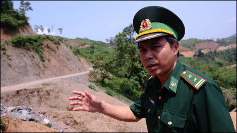 Một trung tá biên phòng người Kinh trước lối vào Huổi Khon, Mường Nhé - hình của AFP/Getty Images