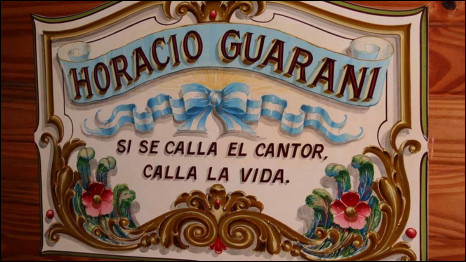 Horacio Guarany, the gravel-voiced godfather of traditional Argentinian music speaks to Danny in his first ever interview with the BBC. Now 85 years old, Horacio has spent a lifetime singing about the poor and dispossessed. He describes living in exile in the 1970s and explains that he thinks of his songs as testimonials, rather than protests. Horacio tells the programme that he does not feel excited about the bicentenary.