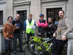 Most folks in this office come to work by bus, train or tube but a few hearty souls ride their bikes in. Here are the BBC Learning English riders (from left to right) Helen - who works on the BBC China Learning English website , Callum, Neil, John – who works on the BBC Arabic Learning English website, me and Paul)