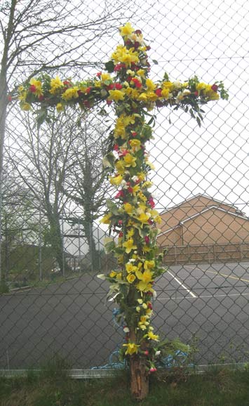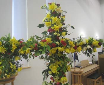 On Easter Sunday morning, during the service, some of the children come in with baskets of flowers. Everyone in the congregation is invited to come up, take one of the flowers and put it on the cross